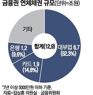 13일 국회 정무위원회 소속 김상훈 국민의힘 의원이 확보한 금융위원회 자료에 따르면 새도약기금 매입 조건에 해당되는 7년 이상 5000만원 이하 민간 보유 연체채권 12조8603억원 중 대부업체가 6조7291억원을 가지고 있어 비중이 52.3%에 달하는 것으로 확인됐다. 업권별로 보유한 연체채권 규모가 구체적으로 나온 건 이번이 처음이다.