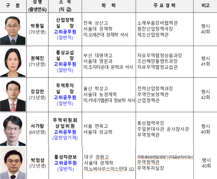 산업통상부 1급 승진 및 전보 대상자 인적사항 <산업통상부> 산업통상자원부가 1급 5명에 대한 전보 및 승진 인사를 단행했다.