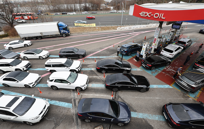 서울 시내 한 주유소에서 시민들이 유가 추가 상승 전 주유를 위해 대기하고 있다. [뉴스1]