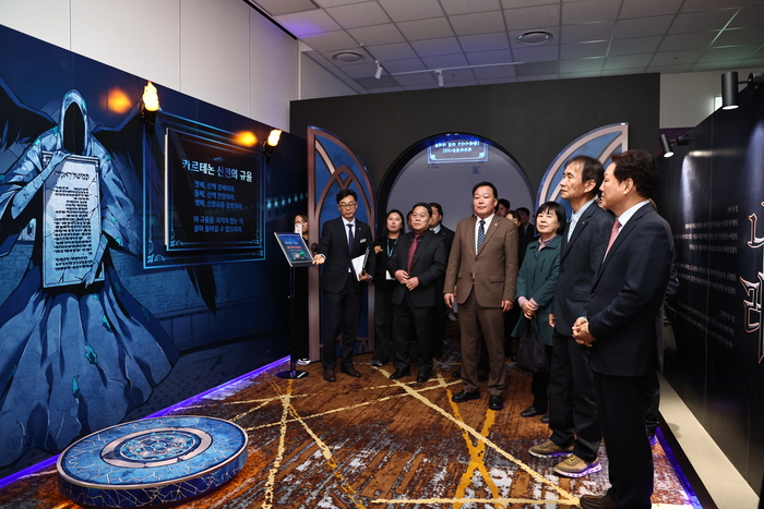 23일 경남 창원시 창원컨벤션센터에 마련된 ‘나 혼자만 레벨업 팝-업 인 세코’ 미디어데이 행사에서 박완수 경남지사(맨왼쪽) 등 관계자들이 행사장을 둘러보고 있다. 행사는 오는 27일부터 5월 17일까지. [경남도] 세계적 흥행 웹툰 ‘나 혼자만 레벨업’의 주인공 성진우가 현실로 걸어 나온 듯한 공간이 경남 창원에 펼쳐졌다. 단순한 전시를 넘어 ‘체험형 세계관’으로 확장된 이번 행사는 팬들의 발길을 끌기에 충분했다.