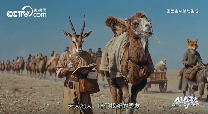 중국 국영 방송사 CCTV AI 제작 애니메이션 ‘유금곡은원록’에 등장하는 상인 길드. 길도 지도자인 낙타가 “세상은 넓다,우리는 새로운 동맹을 찾으면 된다”고 말하고 있다. [CCTV 캡쳐] 영상에서는 세계 경제를 상징하는 ‘상인 길드’도 등장한다. 이들은 기존 무역 체제에 대한 의존도를 줄이고,새로운 무역 경로를 개척한다.