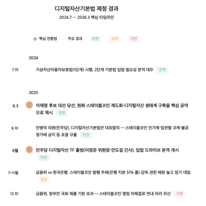 하지만 위 도표에서 알 수 있듯이 첫 1년간은 진전이 주였다가 작년 7월부터 갈등과 지연으로 바뀌기 시작합니다. 이재명 정부 출범 이후 금융 당국과 국회,게다가 민주당 TF와 그 외 의원들까지도 편이 나눠지기만 하면 싸우기에 바빴습니다. 이처럼 갈등과 반목이 지속되면서 법안은 당초 공약 시점과 다르게 올해 1분기를 넘기게 생겼죠.